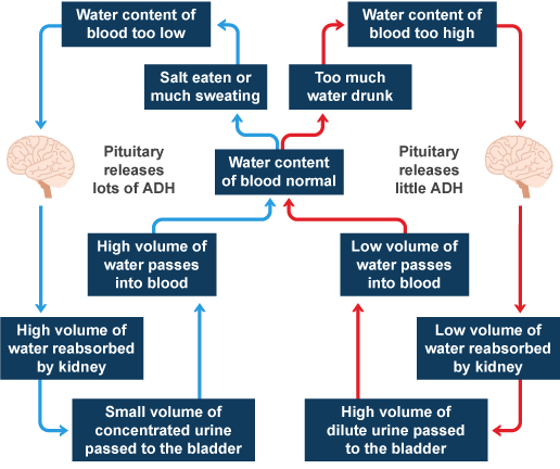 - This regulation is brought about by changing the permeability of distal convoluted tubule and collecting ducts. The change in permeability is affected by anti-diuretic hormone (ADH) or vasopressin released from the posterior lobe of the pituitary. When the amount of water decreases in the blood plasma, it stimulates the secretion of ADH and more water is reabsorbed from the filtrate in the collecting duct. This results in the concentrated urine passing out of the body. Contrarily, when the amount of water increases in blood, it inhibits the secretion of ADH and so, less water is absorbed from the filtrate. In this case, dilute urine is excreted out of the body. Alcohol and certain drugs suppress ADH secretion and more urine is discharged.