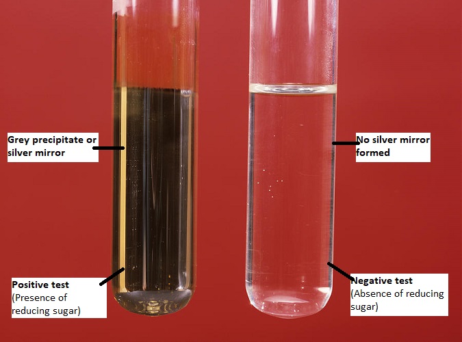- If a dark grey precipitate or silver mirror is formed on the bottom and sides of the test tube, it indicates a positive result. It confirms the presence of reducing sugars/ aldoses/ α-hydroxy ketoses in the sample solution.